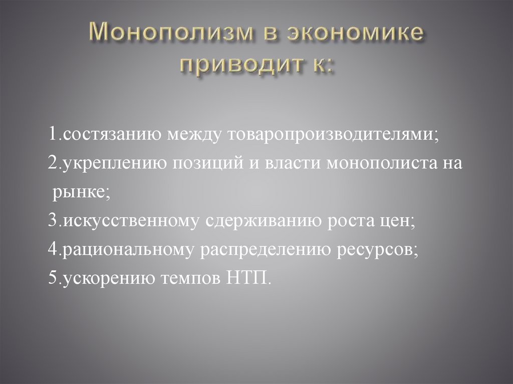 1.состязанию между товаропроизводителями;2.укреплению позиций и власти монополиста на