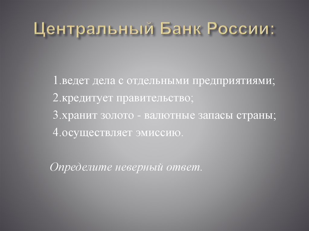 1.ведет дела с отдельными предприятиями;2.кредитует правительство;