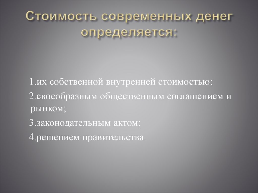 1.их собственной внутренней стоимостью;2.своеобразным общественным соглашением и