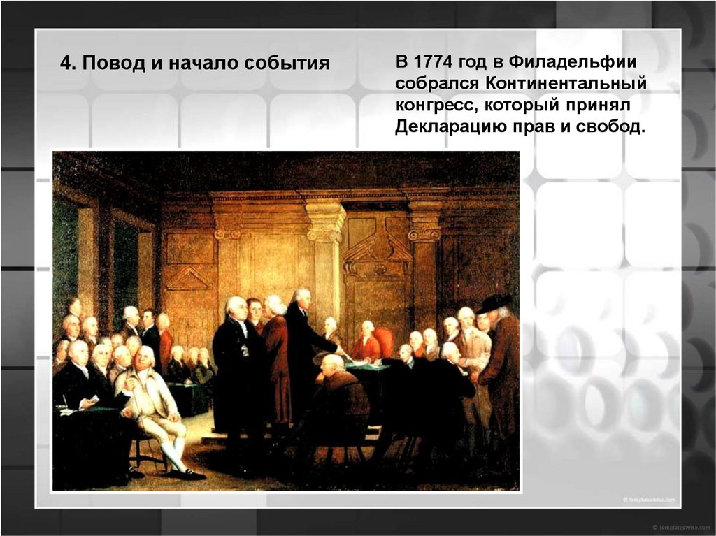 4. Повод и начало событияВ 1774 год в Филадельфии