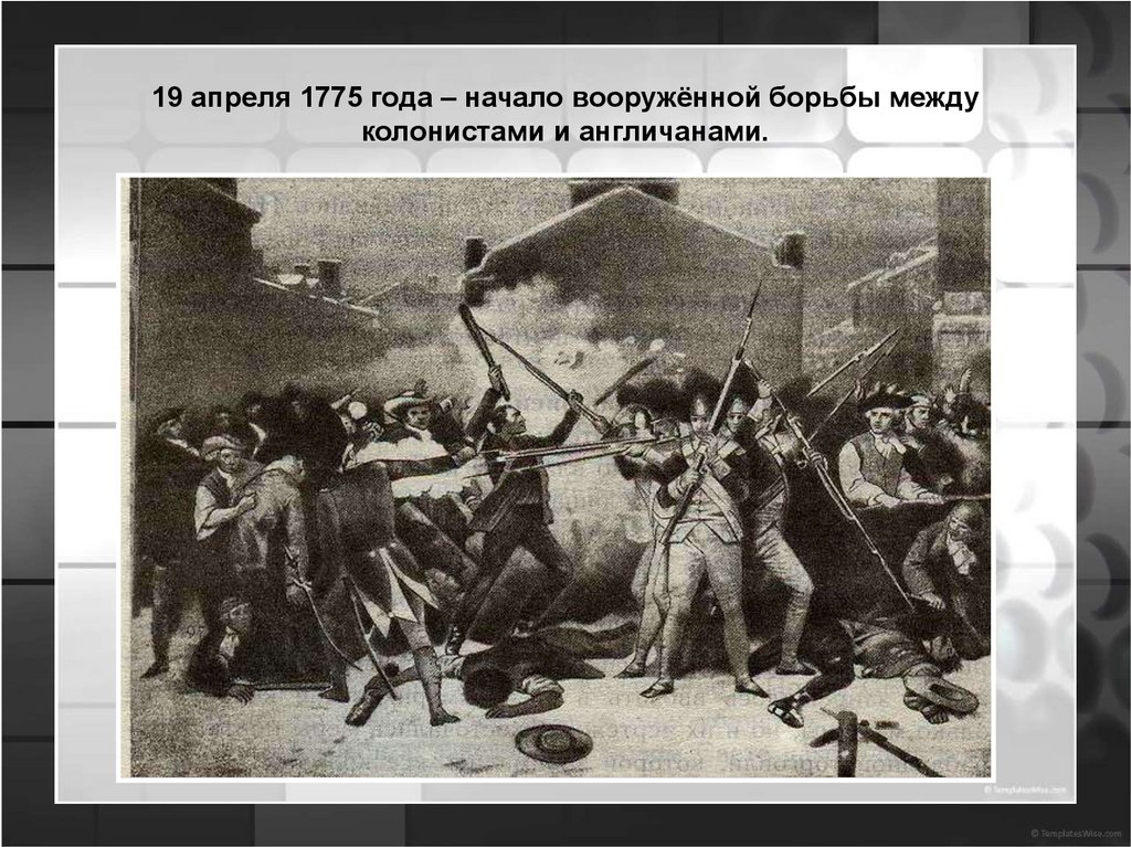 19 апреля 1775 года – начало вооружённой борьбы междуколонистами и англичанами.