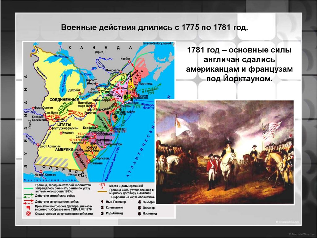 Военные действия длились с 1775 по 1781 год.1781 год – основные силы