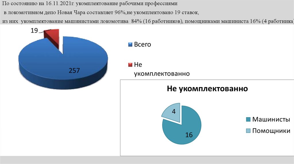 По состоянию на 16.11.2021г. укомплектование рабочими профессиямив локомотивном депо Новая Чара составляет 96%,не укомплектовано 19 ставок,