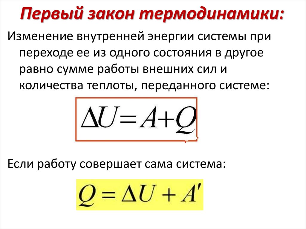 Первый закон термодинамики:Изменение внутренней энергии системы при