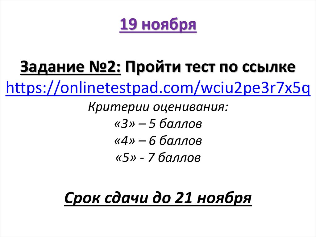 19 ноябряЗадание №2: Пройти тест по ссылке