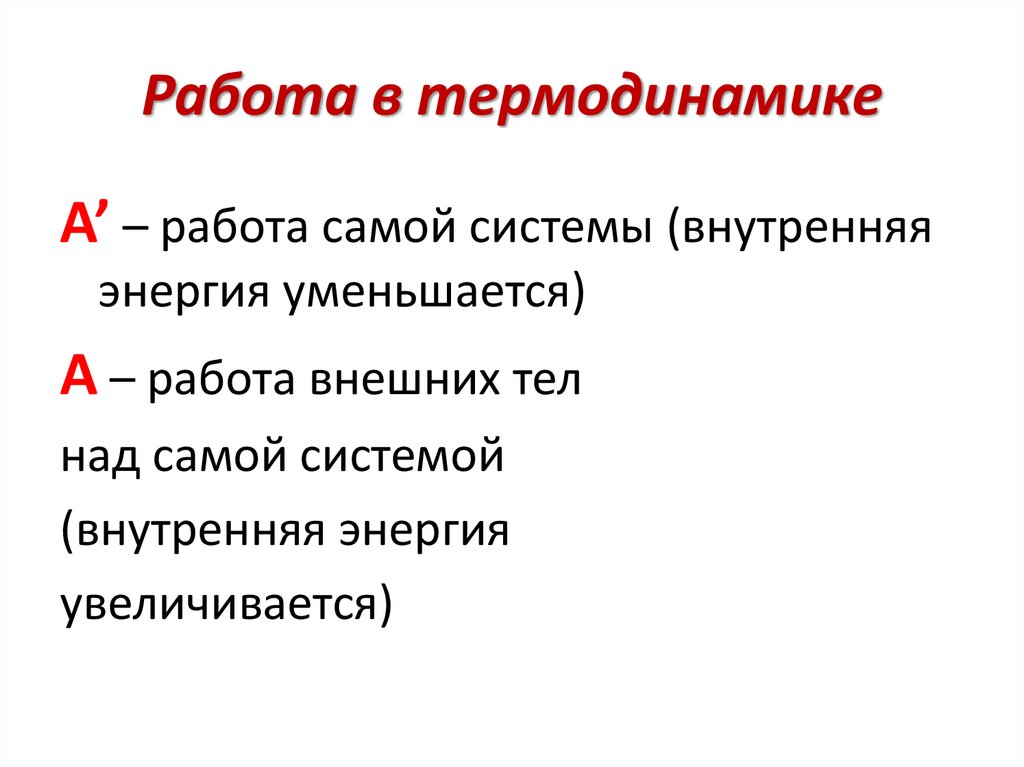 Работа в термодинамикеА’ – работа самой системы (внутренняя