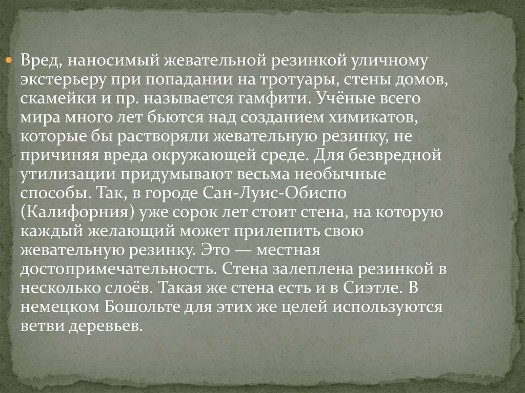 Вред, наносимый жевательной резинкой уличномуэкстерьеру при попадании на тротуары, стены домов,