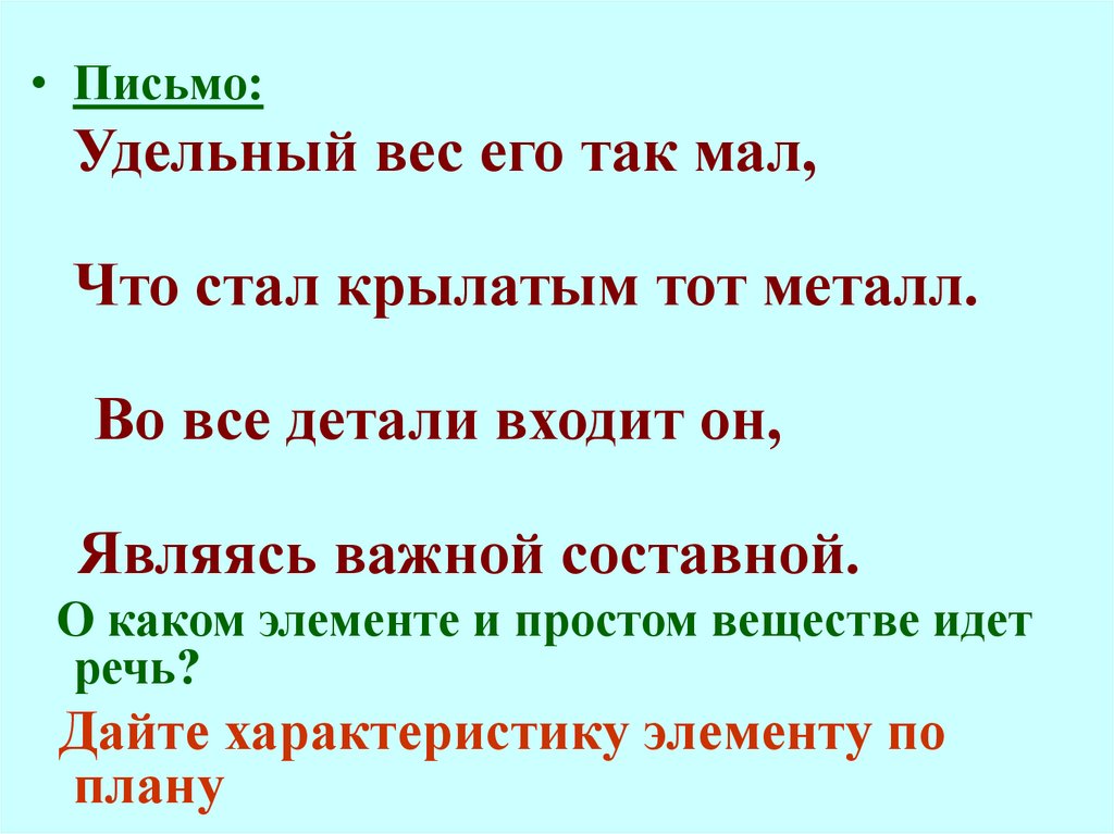 • Письмо:Удельный вес его так мал,