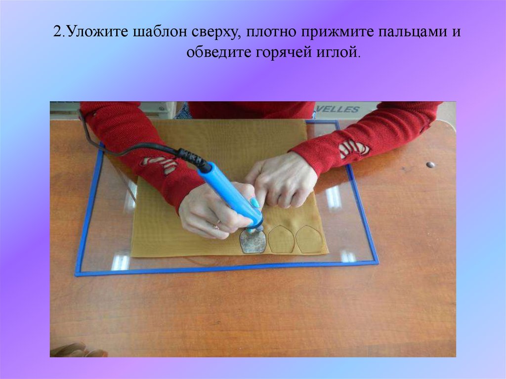 2.Уложите шаблон сверху, плотно прижмите пальцами иобведите горячей иглой.