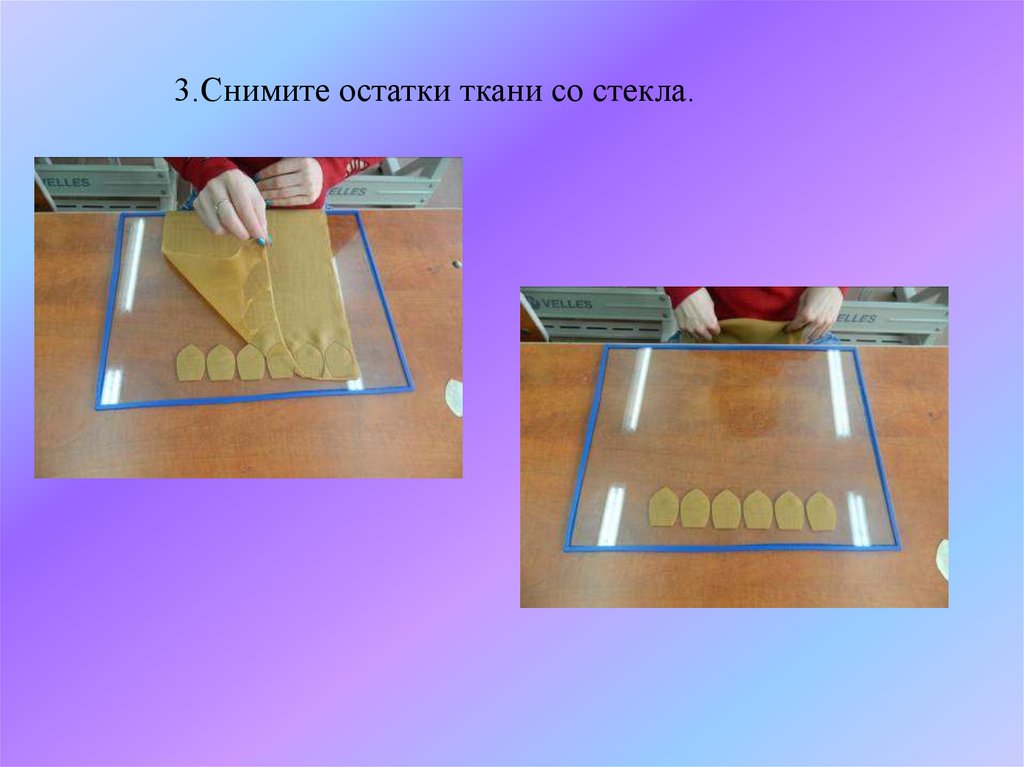 3.Снимите остатки ткани со стекла.14. 4. Снимите готовые детали со стекла.