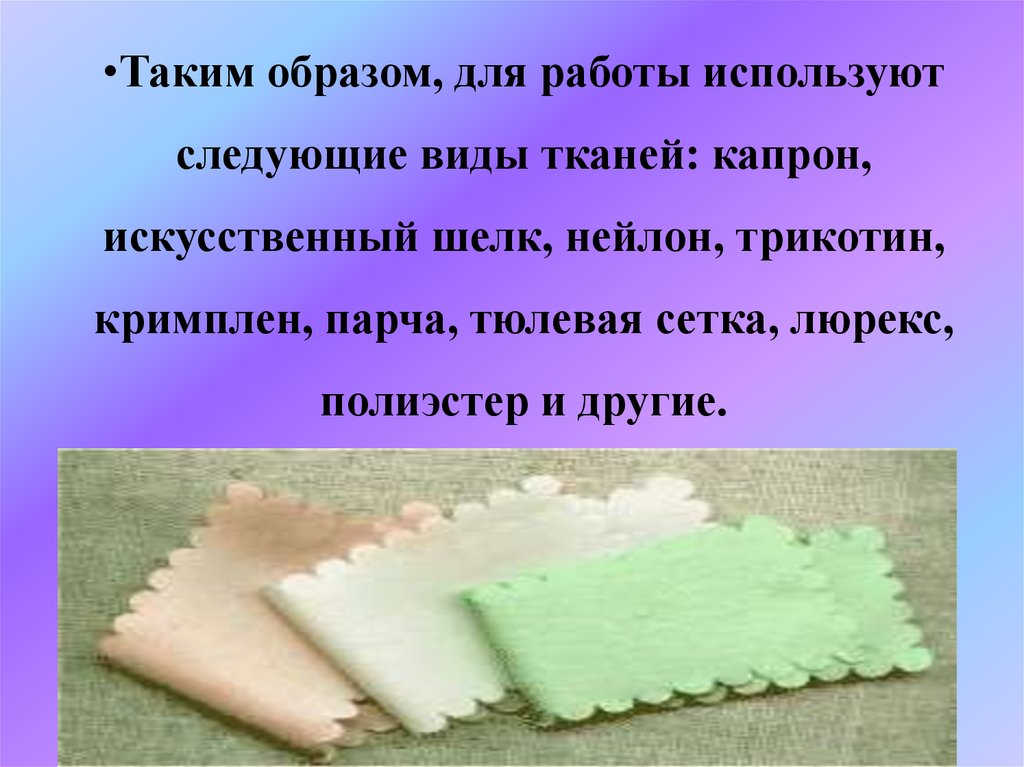 •Таким образом, для работы используютследующие виды тканей: капрон,