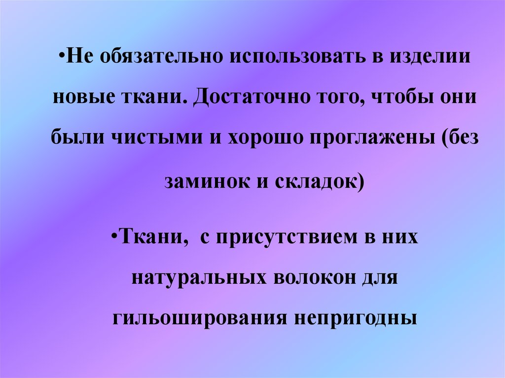 •Не обязательно использовать в изделииновые ткани. Достаточно того, чтобы они