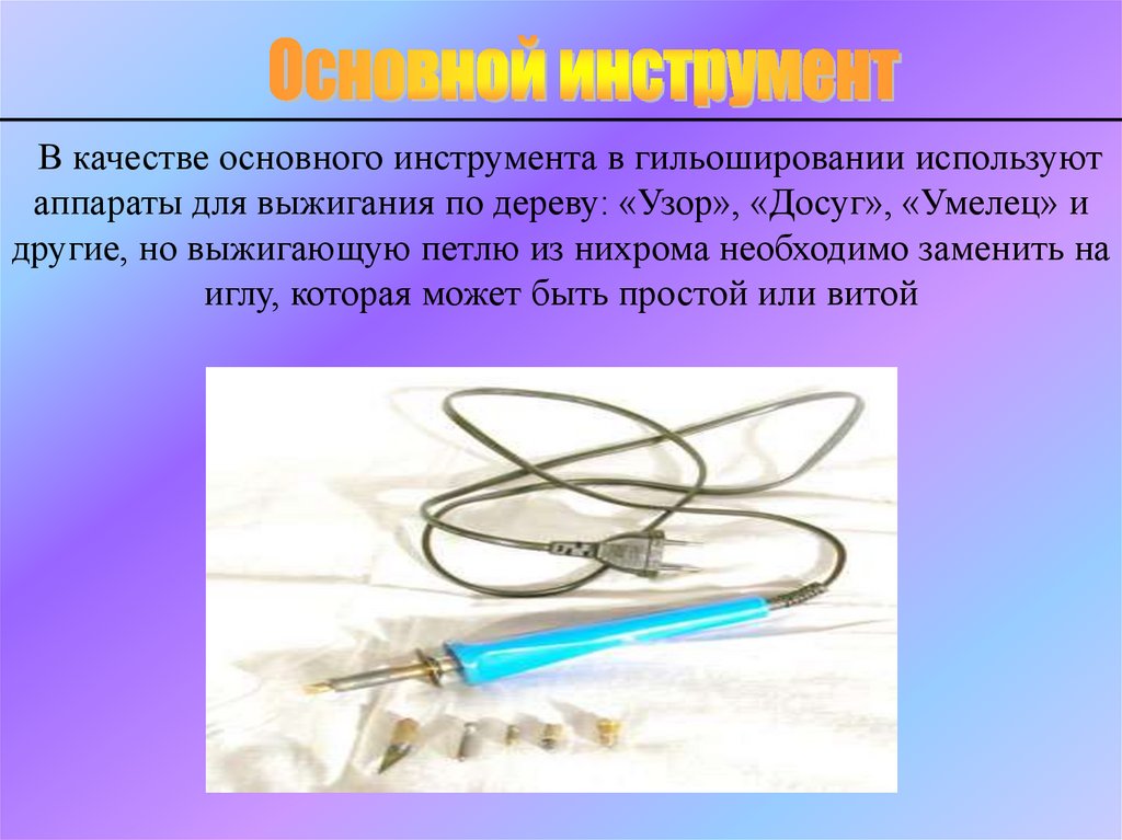 В качестве основного инструмента в гильошировании используютаппараты для выжигания по дереву: «Узор», «Досуг», «Умелец» и