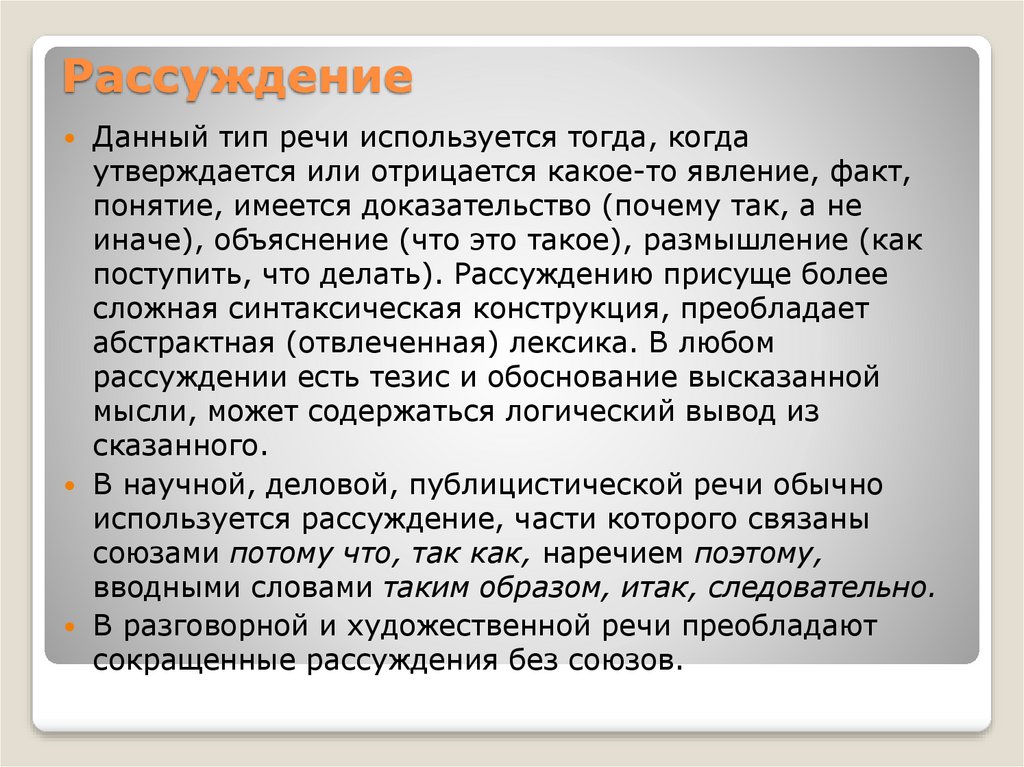 РассуждениеДанный тип речи используется тогда, когда