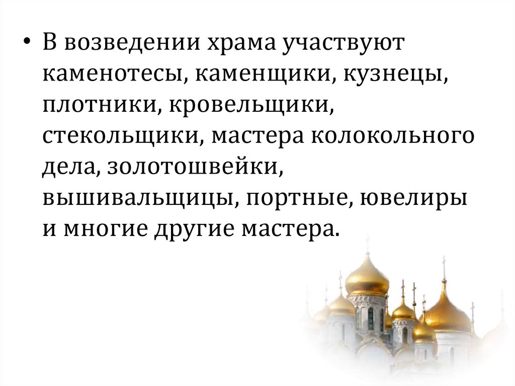 • В возведении храма участвуюткаменотесы, каменщики, кузнецы,