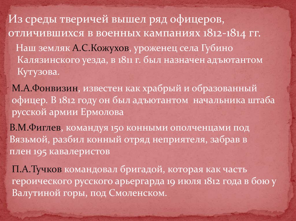 Из среды тверичей вышел ряд офицеров,отличившихся в военных кампаниях 1812-1814 гг.