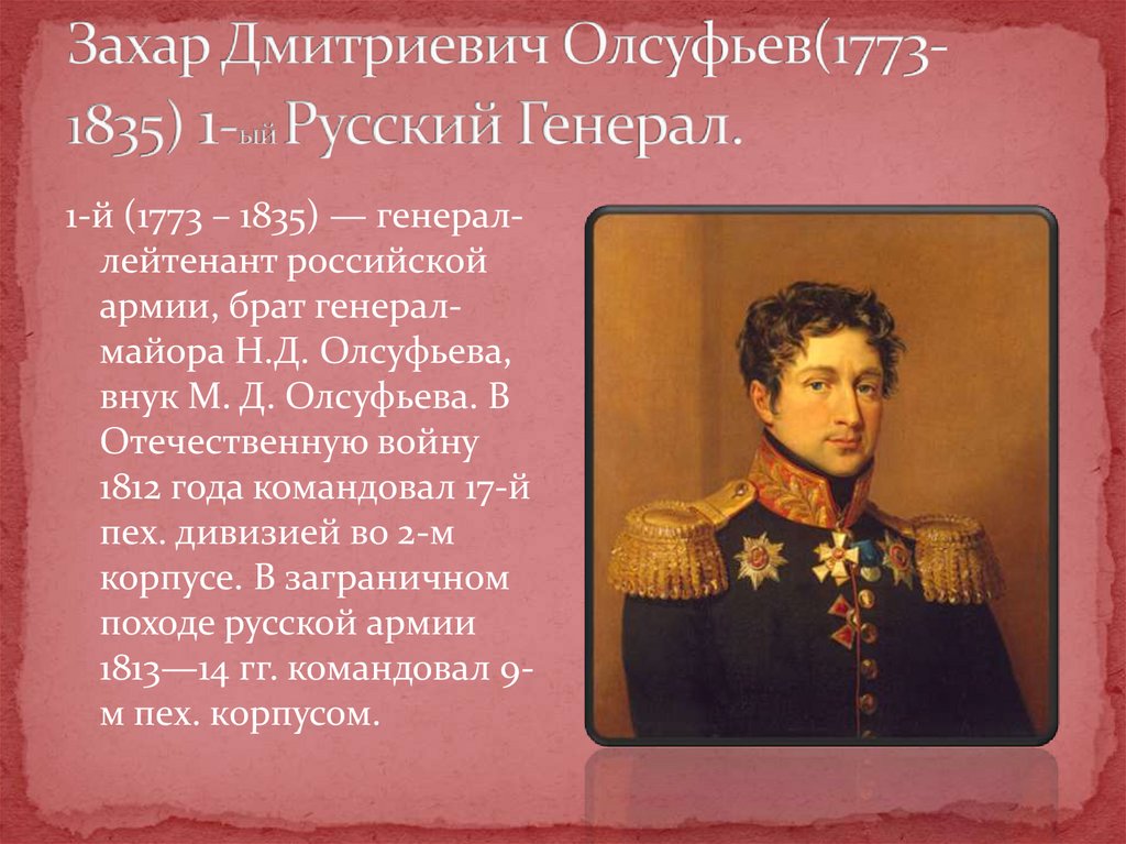 1-й (1773 – 1835) — генераллейтенант российскойармии, брат генералмайора Н.Д. Олсуфьева,