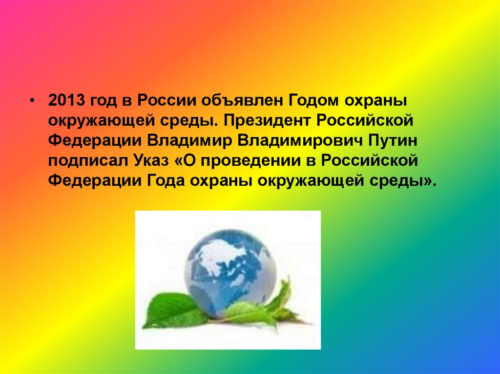 • 2013 год в России объявлен Годом охраныокружающей среды. Президент Российской