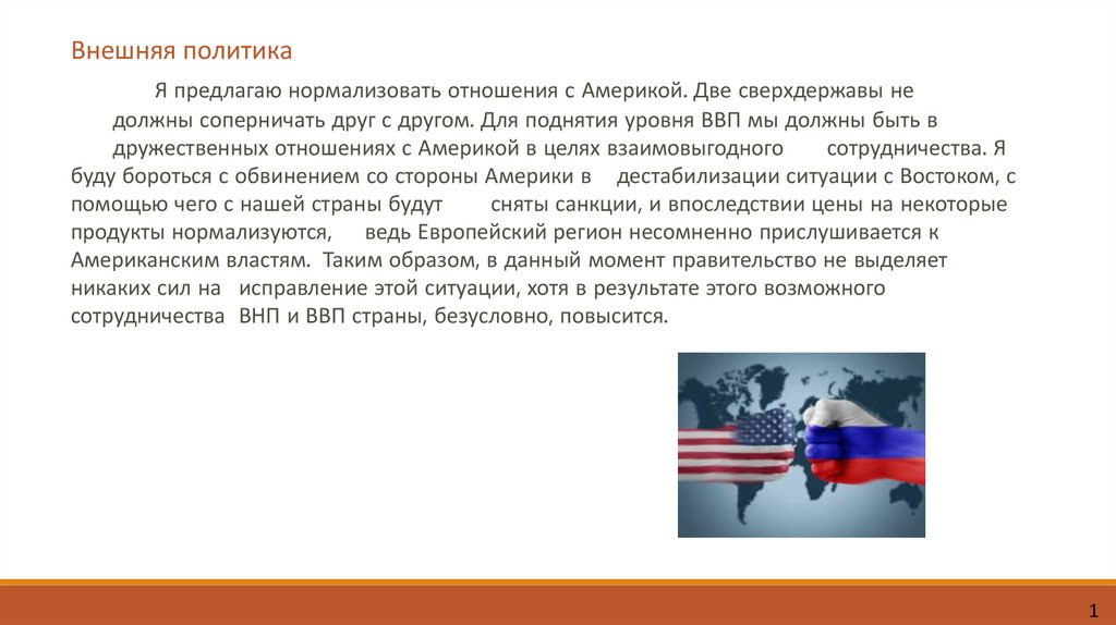 Внешняя политикаЯ предлагаю нормализовать отношения с Америкой. Две сверхдержавы не