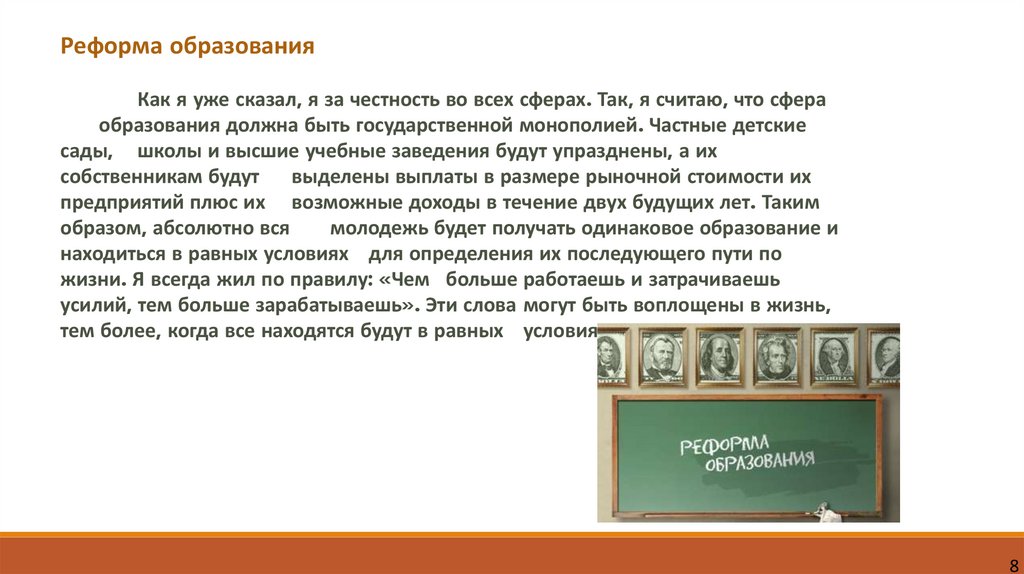 Реформа образованияКак я уже сказал, я за честность во всех сферах. Так, я считаю, что сфера