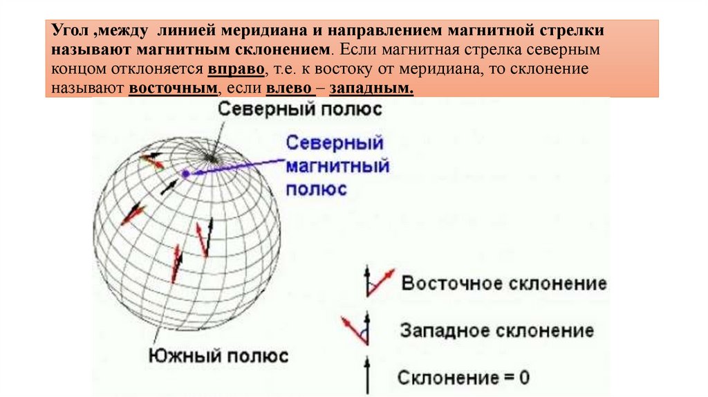 Угол ,между линией меридиана и направлением магнитной стрелкиназывают магнитным склонением. Если магнитная стрелка северным