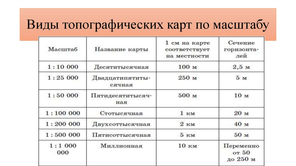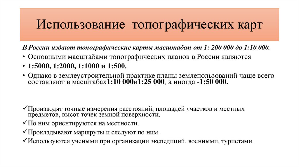 Использование топографических картВ России издают топографические карты масштабом от 1: 200 000 до 1:10 000.