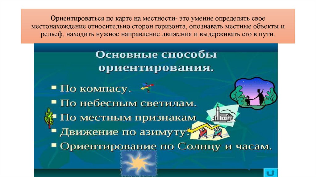 Ориентироваться по карте на местности- это умение определять своеместонахождение относительно сторон горизонта, опознавать местные объекты и