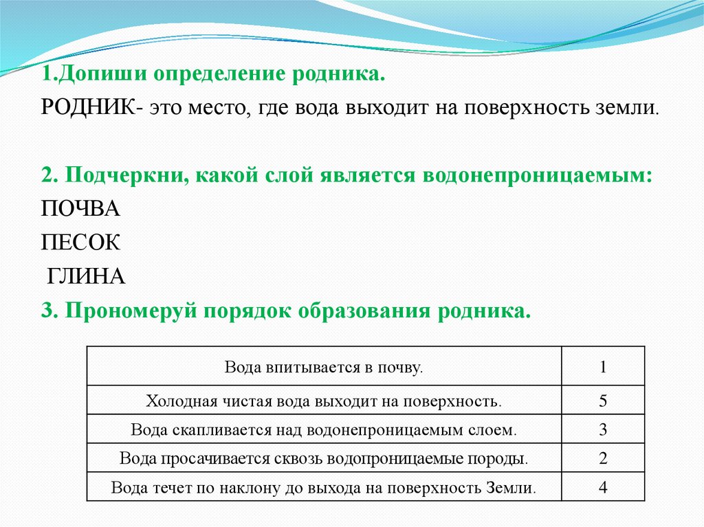 1.Допиши определение родника.РОДНИК- это место, где вода выходит на поверхность земли.