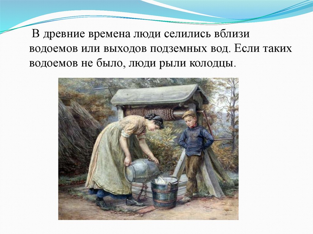 В древние времена люди селились вблизиводоемов или выходов подземных вод. Если таких