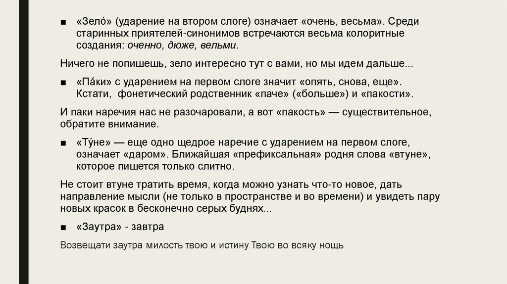 ■ «Зело́» (ударение на втором слоге) означает «очень, весьма». Средистаринных приятелей-синонимов встречаются весьма колоритные