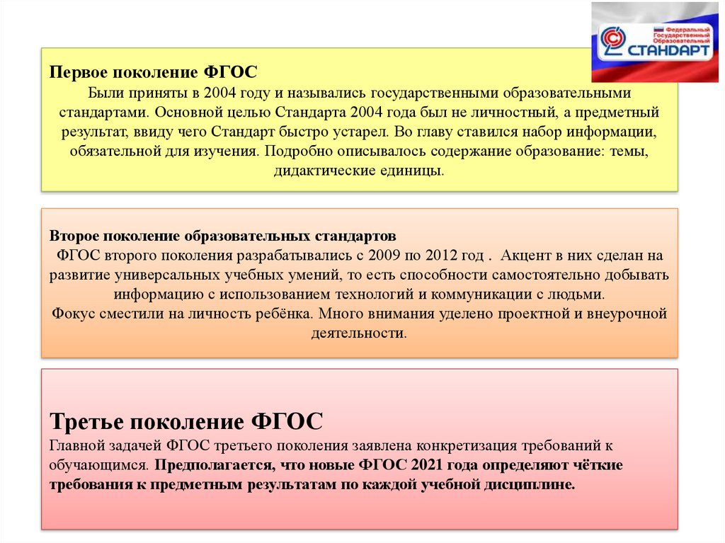 Первое поколение ФГОСБыли приняты в 2004 году и назывались государственными образовательными