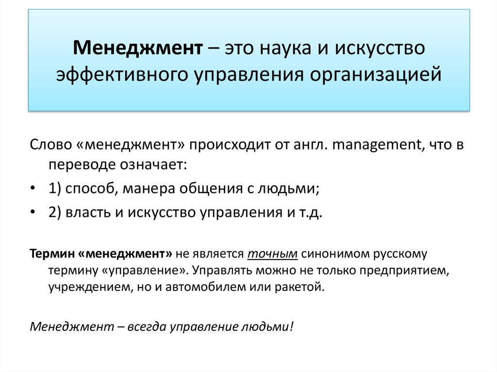 Слово «менеджмент» происходит от англ. management, что в