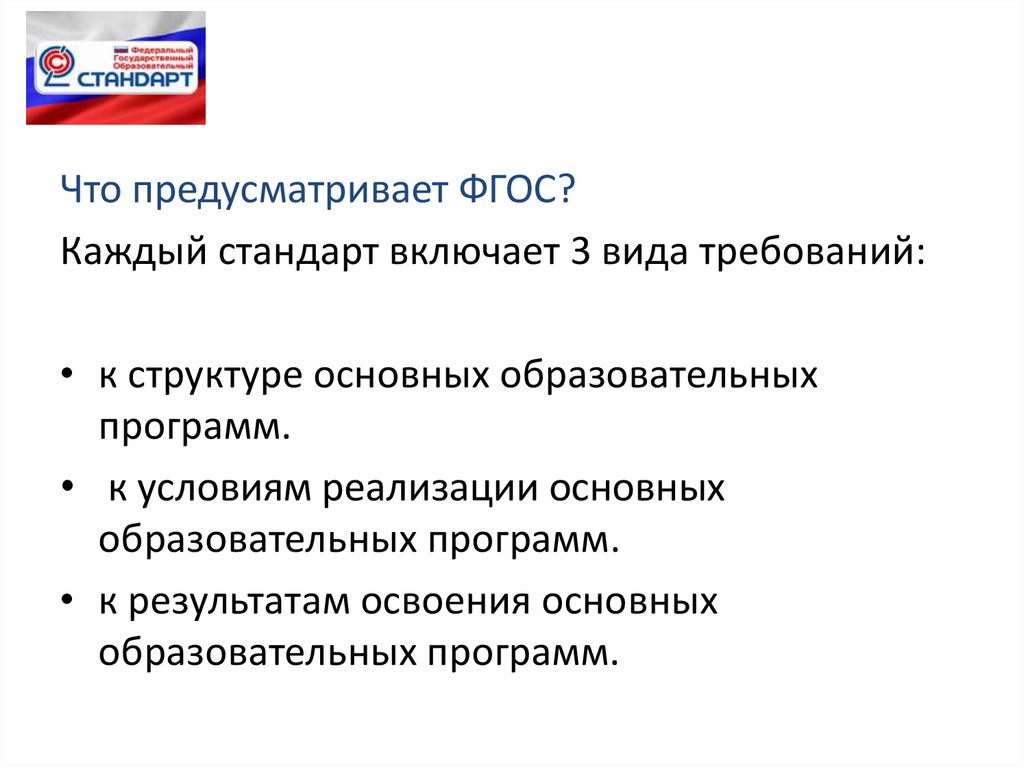 Что предусматривает ФГОС?Каждый стандарт включает 3 вида требований: