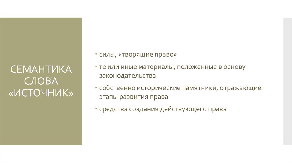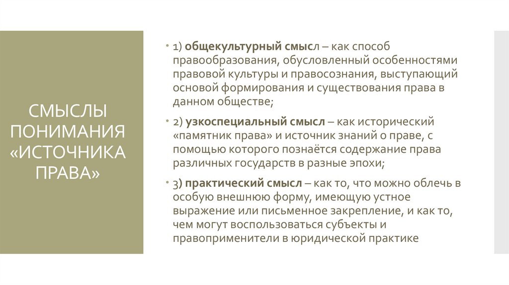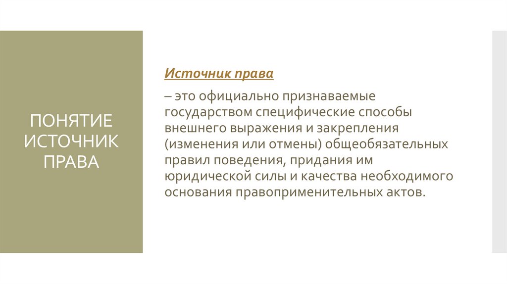 • Виды: нормативный акт, судебный прецедент, нормативный