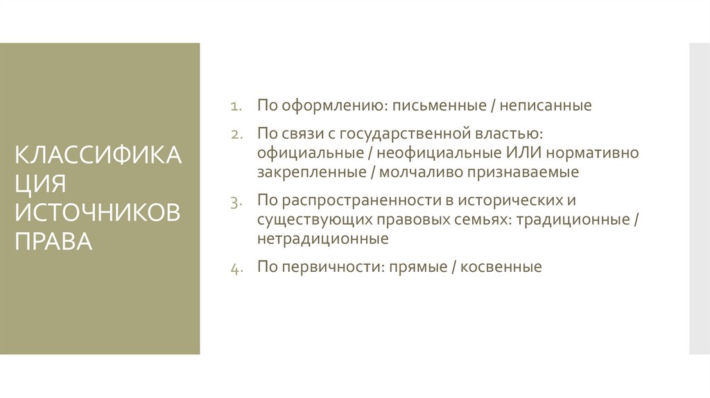 1. По оформлению: письменные / неписанныеКЛАССИФИКА