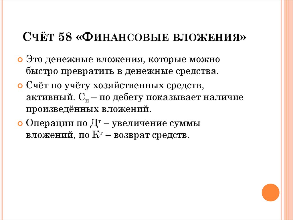 СЧЁТ 58 «ФИНАНСОВЫЕ ВЛОЖЕНИЯ»Это денежные вложения, которые можно