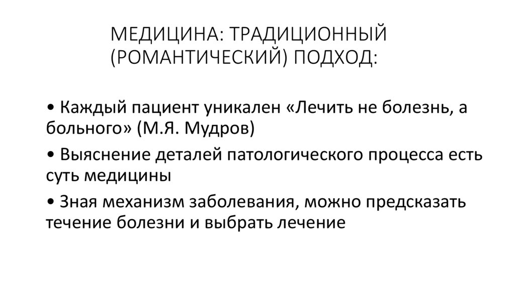 МЕДИЦИНА: ТРАДИЦИОННЫЙ(РОМАНТИЧЕСКИЙ) ПОДХОД:
