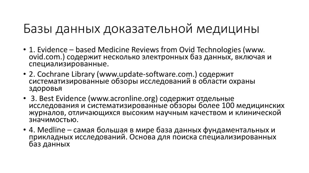 Базы данных доказательной медицины• 1. Evidence – based Medicine Reviews from Ovid Technologies (www.