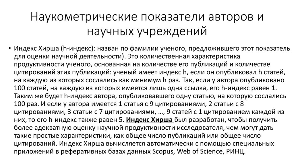 • Индекс Хирша (h-индекс): назван по фамилии ученого, предложившего этот показатель