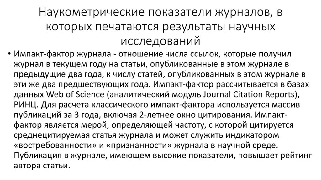 • Импакт-фактор журнала - отношение числа ссылок, которые получил