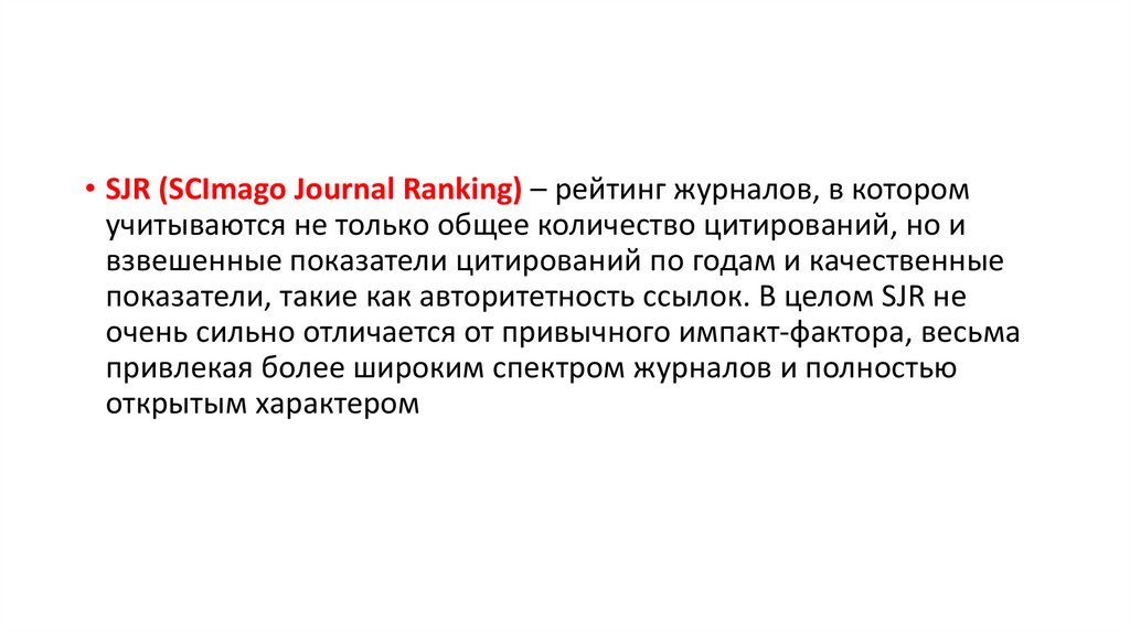 • SJR (SCImago Journal Ranking) – рейтинг журналов, в которомучитываются не только общее количество цитирований, но и