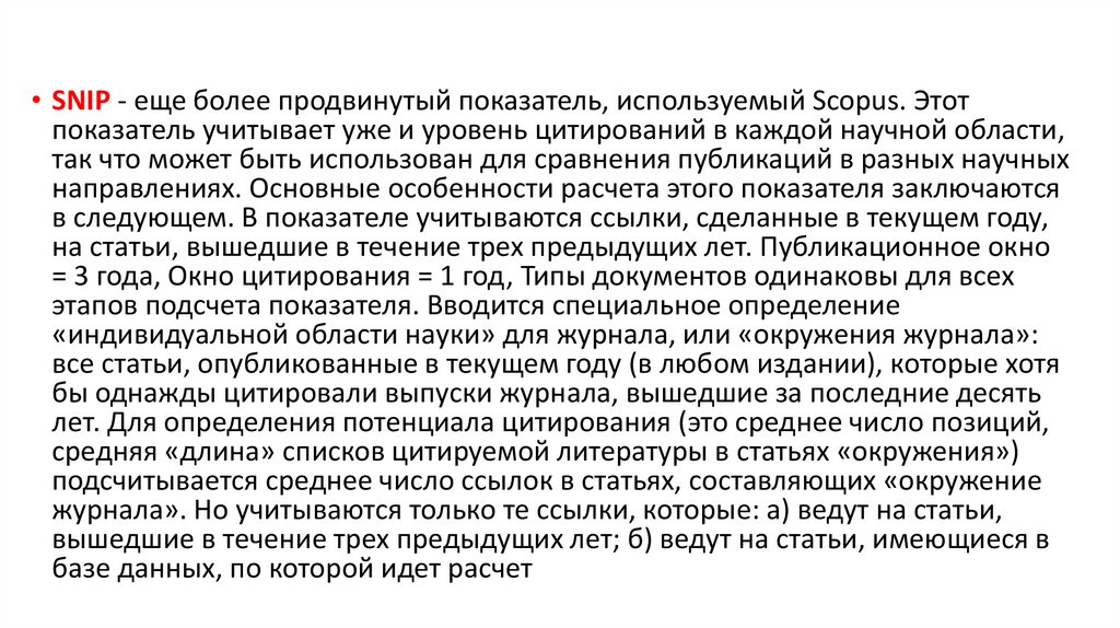 • SNIP - еще более продвинутый показатель, используемый Scopus. Этотпоказатель учитывает уже и уровень цитирований в каждой научной области,