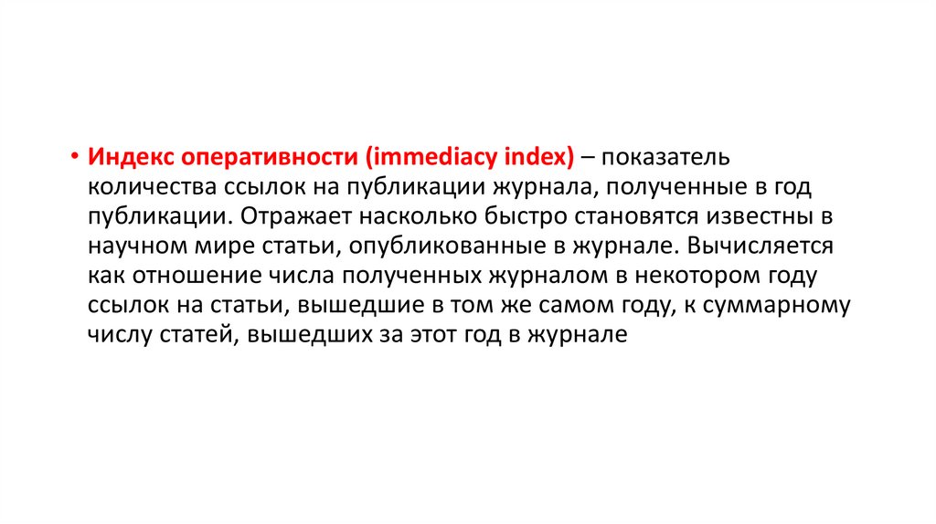 • Индекс оперативности (immediacy index) – показательколичества ссылок на публикации журнала, полученные в год