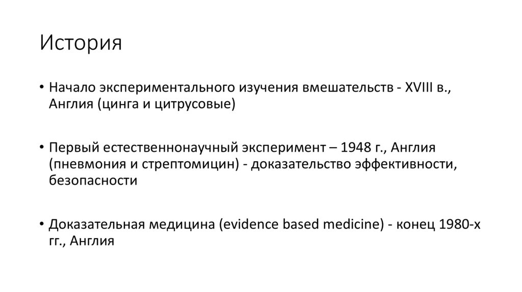 История• Начало экспериментального изучения вмешательств - XVIII в.,