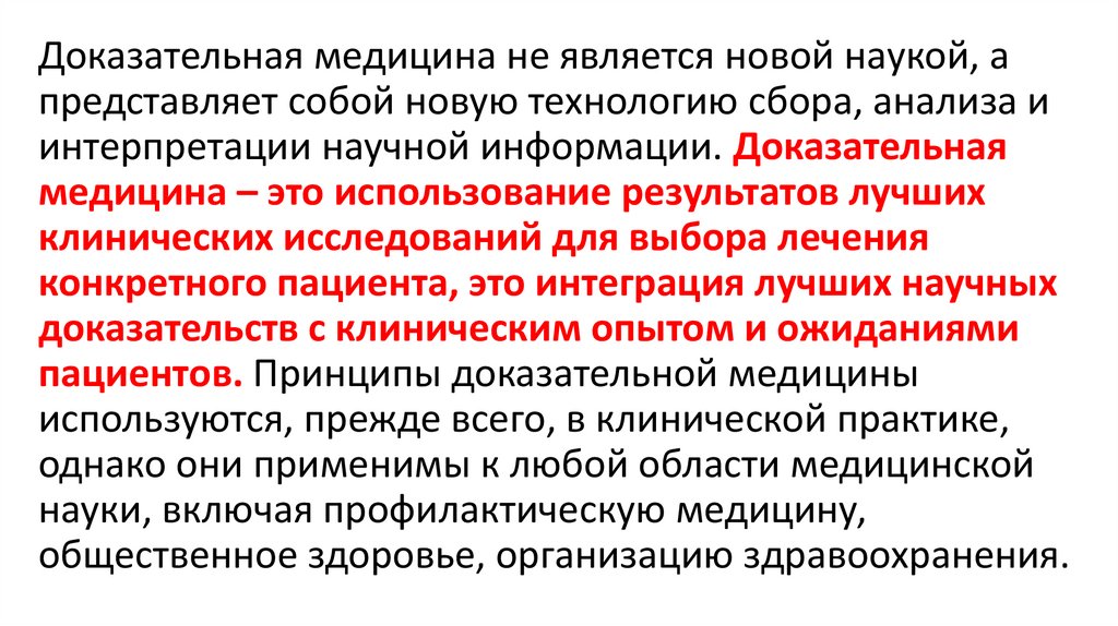 Доказательная медицина не является новой наукой, апредставляет собой новую технологию сбора, анализа и