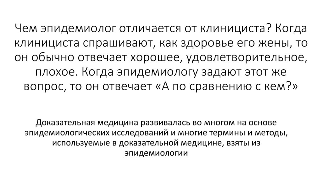 Чем эпидемиолог отличается от клинициста? Когдаклинициста спрашивают, как здоровье его жены, то