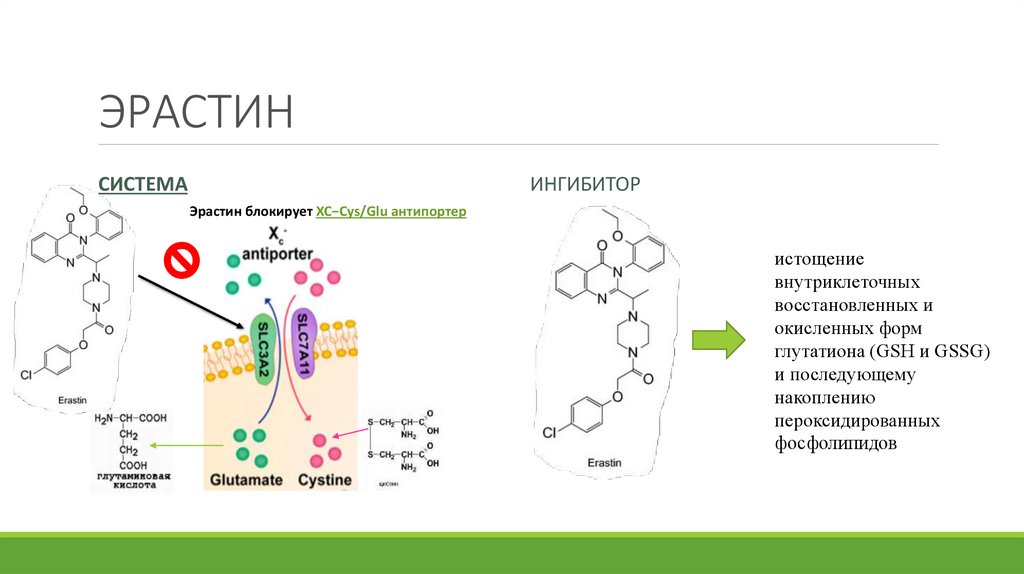 Эрастин блокирует XC−Cys/Glu антипортер